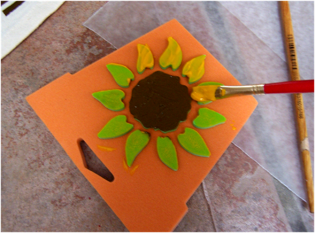 6. Roll the inked brayer over your stamp until all areas that remained sticking up are covered in fabric paint.