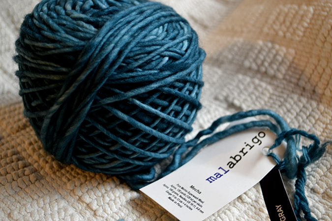 Mecha means "single ply" in Uruguayan Spanish and is a wonderfully soft, squishy superwash merino wool. It's bulky, but not super bulky- just right. This colorway is named "green gray" - the green isn't obvious, though. It's more the fleeting hints of green you see as indigo dyed fiber is oxidizing to blue.